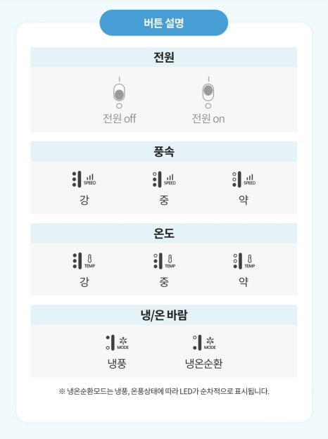 위에서 부터 3단계 풍속 조절, 3단계 온도 조절, 냉/온풍 순환 모드